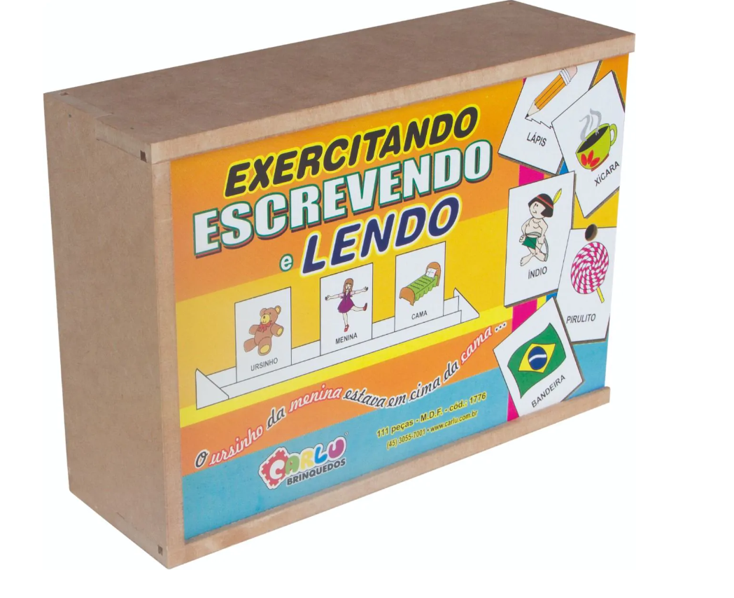 O jogo estimula a construção da linguagem escrita. Confeccionado em M.D.F. 110 peças, sendo: 110 desenhos com nomes (abaixo da ilustração do desenho está escrito o nome correspondente ao desenho ex: Ilustração (Castelo) – Castelo, Ilustração (Nuvens com gotas) – Chuva, etc.), 01 canaleta organizadora (com 01 divisória para encaixe das peças e 01 régua solta para esconder o nome do desenho) todas pintadas e serigrafas em uma das faces com tinta ultravioleta atóxica. Peças com desenho medindo 5 x 7 cm, canaleta medindo 25,5 x 5 x 3 cm e régua solta medindo 24,5 x 1,3 cm. Embalagem: Caixa de madeira com tampa serigrafada medindo 28 x 20 x 9 cm. Lacrada com película de P.V.C. encolhível.