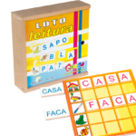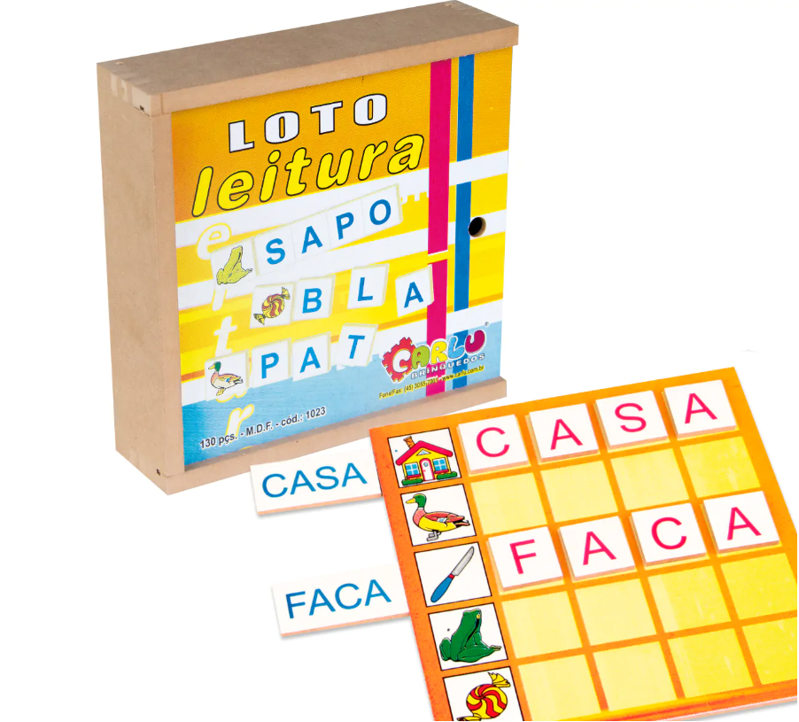 Um jogo divertido com figuras coloridas, que irá chamar a atenção das crianças para o desenvolvimento da linguagem escrita. Jogo confeccionado em M.D.F. 130 peças, composto por 5 tabuleiros medindo 14,5 x 14,5 cm, 25 retângulos de 4 x 2,2 cm, 100 fichas (quadradinhos) medindo 2 x 2 cm, serigrafadas com tinta ultravioleta atóxica. Embalagem: Caixa de madeira com tampa serigrafada, medindo 18 x 18 x 5 cm. Lacrada com película de P.V.C. encolhível.
