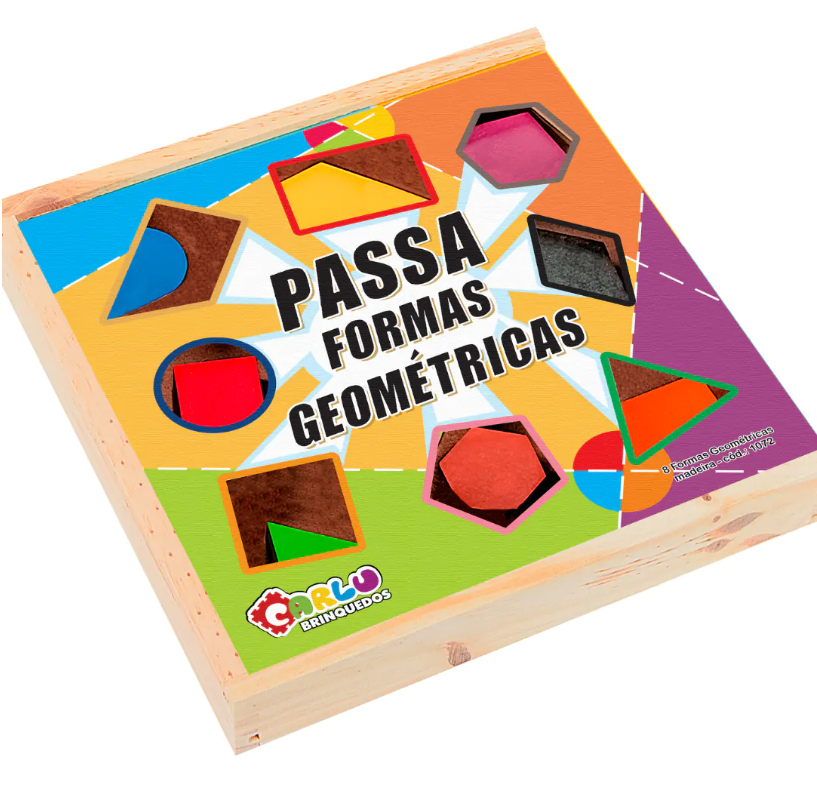 Confeccionado em M.D.F. 8 formas geométricas (Triângulo, círculo, quadrado, retângulo, pentágono, trapésio, hexágono, losango) coloridas pintadas com tinta atóxica. Embalagem: Caixa de madeira com tampa serigrafada, vazada nas formas geométricas medindo 24 x 24 x 3,5 cm. Lacrada com película de P.V.C. encolhível.