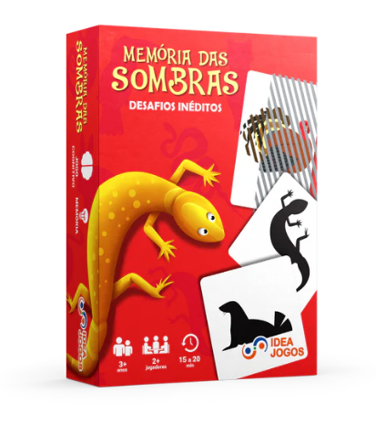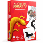 “Memória das sombras” é um jogo de memória e percepção visual para 2 a 4 jogadores, indicado a partir de 6 anos. O desafio é encontrar pares entre animais coloridos, suas sombras e silhuetas espelhadas. As cartas são embaralhadas e viradas para baixo, e os jogadores testam a memória a cada rodada.